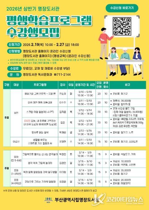 코리아타임뉴스 사회팀 | 부산시교육청 명장도서관은 3월부터 5월까지 명장도서관에서 유아, 초등학생, 성인 등 175명을 대상으로 ‘2026 상반기 평생학습 프로그램’을 운영한다.
