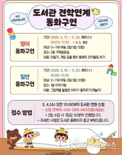 수업은 3월 17일부터 5월 26일까지 매주 화요일과 수요일 총 20회차로 진행되며, 일반 동화구연(2~7세 대상)과 영어 동화구연(5~7세 대상)으로 나눠 운영된다.