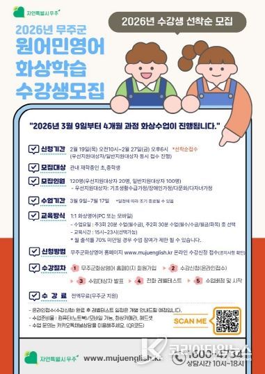 코리아타임뉴스 전북취재본부 | 무주군이 지역 내 초·중학생을 대상으로 ‘원어민 화상영어 지원사업’을 추진한다고 밝혔다. 이 사업은 지역 간 교육격차를 해소하고 글로벌 인재 양성을 위해 진행하는 것으로, ‘원어민 강사와의 1:1 화상영어 수업’ 수강료를 전액 지원한다.