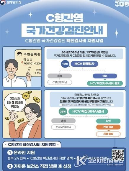또한 2025년 국가건강검진에서 C형간염 항체 양성 판정을 받고 확진검사를 받았으나 검사비를 신청하지 않았거나, 종합병원급 이상 의료기관에서 검사를 받아 기존 지원 대상에서 제외됐던 56세(2025년 기준 1969년생)도 2026년 3월 31일까지 신청하면 소급 지원을 받을 수 있다.