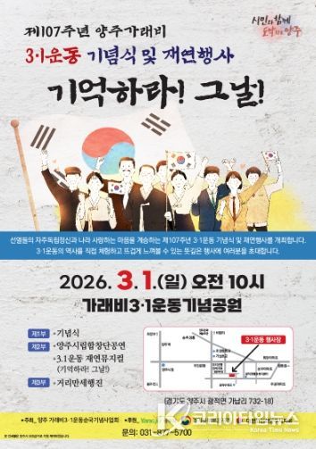 코리아타임뉴스 기동취재팀 | 양주시가 오는 3월 1일 오전 10시, 광적면 가래비 3.1운동 기념공원(양주시 광적면 가납리 732-18)에서 ‘제107주년 양주 가래비 3.1운동 기념식 및 재연행사’를 개최한다.