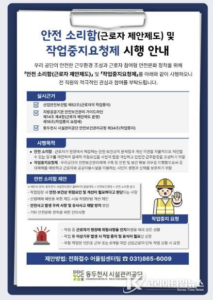 코리아타임뉴스 경기취재본부 | 동두천시 시설관리공단은 근로자의 자발적 참여를 바탕으로 안전보건 관리체계를 강화하기 위해 안전보건 제안제도인 ‘안전 소리함’을 운영하고 있다.