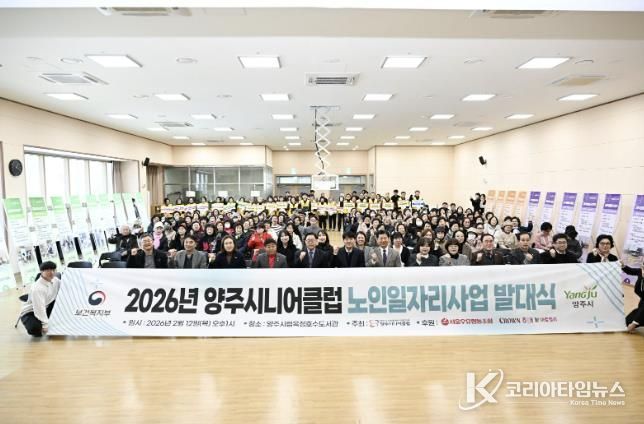 코리아타임뉴스 기동취재팀 | 양주시가 지난 12일 옥정호수도서관 3층 예술극장에서 양주시니어클럽 주관으로 ‘2026년 노인일자리 및 사회활동지원사업 발대식’을 개최했다. 이날 행사에는 노인일자리 참여 어르신과 관계자 등 180여 명이 참석해 성황을 이뤘다.