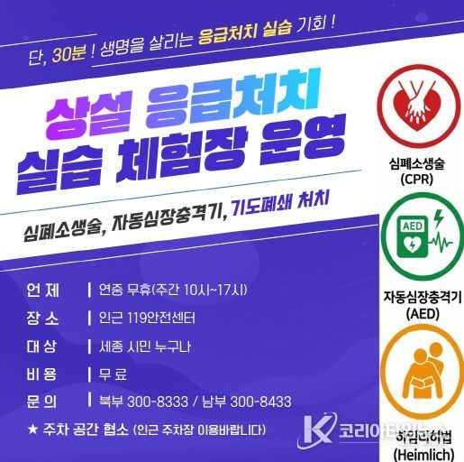 코리아타임뉴스 김태훈 기자 | 세종소방본부가 오는 23일부터 관내 모든 119안전센터에 상설 응급처치 실습 체험장을 운영한다.