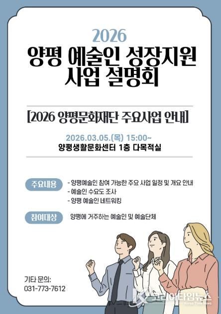 코리아타임뉴스 기동취재팀 | 양평문화재단은 오는 3월 5일, 양평생활문화센터 1층 다목적실에서 지역 예술인의 지속 가능한 활동을 지원하기 위한 ‘2026 예술인 성장지원사업 설명회’를 개최한다고 밝혔다.