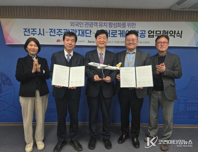 코리아타임뉴스 김태훈 기자 | 전주시와 전주관광재단이 청주국제공항 거점 항공사인 에어로케이(Aero K)와 손을 맞잡고 전주 관광의 글로벌 영토 확장을 위한 하늘길을 열기로 했다.