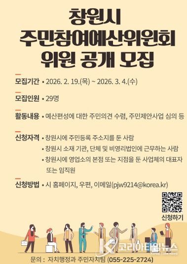 코리아타임뉴스 오영주 기자 | 창원특례시는 올해 3월 말로 만료되는 주민참여예산위원 임기를 맞아 원활한 위원회 운영을 위해 2월 19일부터 3월 4일까지 신규 위원 29명을 모집한다.