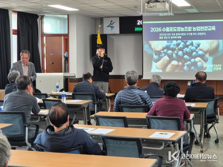 코리아타임뉴스 충북취재본부 | 옥천군농업기술센터는 지난 20일 옥천수출포도영농조합법인 회원 30여 명을 대상으로 비가림 포도의 시기별 과원관리와 신규 식재 후 수형관리에 관한 이론 교육을 실시했다고 밝혔다. 이번 교육은 법인 정기총회와 연계해 진행됐다.