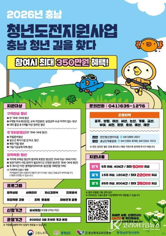 코리아타임뉴스 충남취재본부 | 공주시는 충남청년센터와 협력해 구직에 어려움을 겪는 지역 청년을 대상으로 ‘2026 청년도전지원사업’ 참여자를 상시 모집한다고 밝혔다.