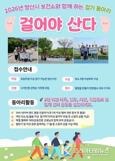 코리아타임뉴스 의료보건팀 | 양산시는 시민의 신체활동 증진과 건강한 생활습관 형성을 위한 ‘걷기 동아리’참여 팀을 3월 3일부터 모집한다고 밝혔다.
