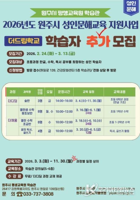 코리아타임뉴스 이아름 기자 | 원주시 학습관은 2026년 성인문해교육 지원사업 ‘더드림(The Dream)학교’의 성인 문해 기초 과목 학습자를 추가 모집한다.