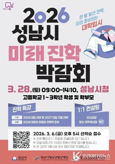 코리아타임뉴스 경기취재본부 | 성남시청소년청년재단은 오는 3월 28일 오전 9시부터 오후 2시 10분까지 성남시청에서 '2026 성남시 미래진학박람회'를 개최한다고 밝혔다. 이번 박람회는 성남시 고등학교 1~3학년 학생과 학부모를 대상으로 진행된다.
