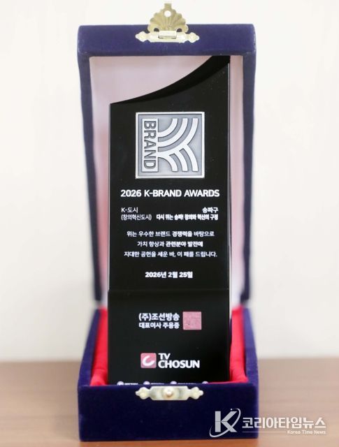 코리아타임뉴스 기동취재팀 | 서울 송파구가 25일 서울 더플라자호텔에서 열린 ‘2026 TV조선 K-브랜드 어워즈’ 시상식에서 K-도시(창의혁신도시) 부문 대상을 수상했다.