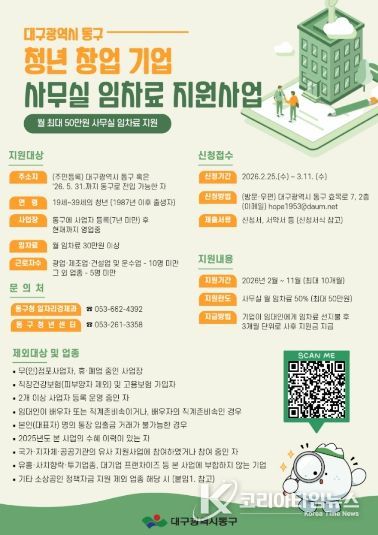 코리아타임뉴스 대구취재본부 | 대구 동구청은 지역 내 청년 창업가들의 초기 경영 부담을 완화하고 안정적인 사업 환경을 조성하기 위해 ‘2026년 청년 창업기업 사무실 임차료 지원사업’을 추진한다.