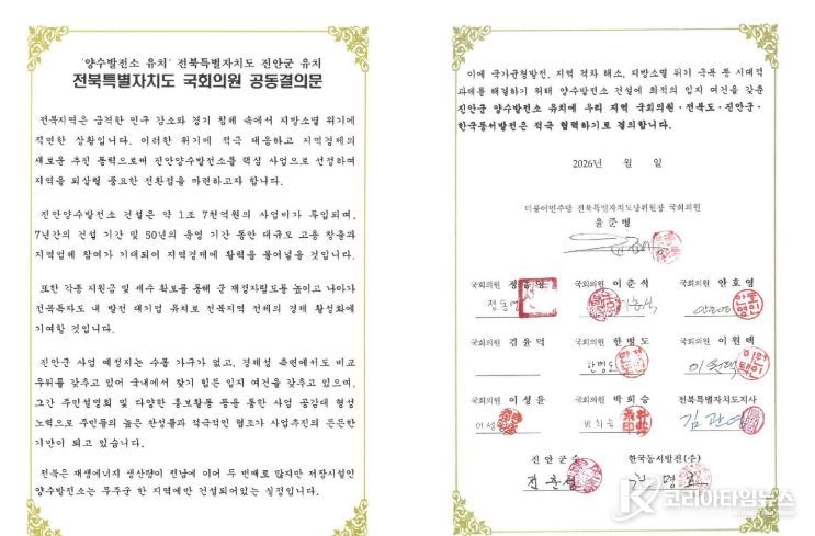 진안군 관계자는 “양수발전소 유치는 진안군을 넘어 전북 전체의 미래 경쟁력과 직결된 과제”라며 “전북특별자치도와 지역 국회의원들이 함께 뜻을 모아 공동서명으로 이어졌다는 것은 전북이 하나의 팀으로 움직이고 있다는 상징적인 의미를 갖는다”고 밝혔다.