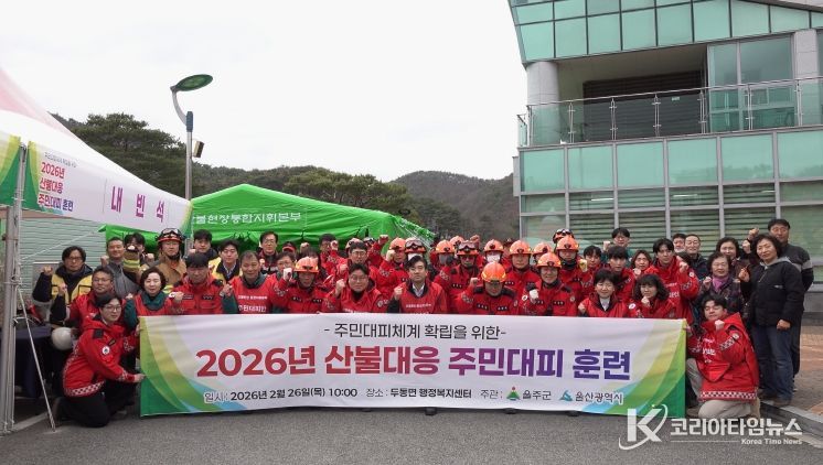 코리아타임뉴스 울산취재본부 | 울산 울주군이 26일 두동면 구미리 일대에서 서울주소방서, 울주경찰서, 양산국유림관리소, 한국전력공사 등 유관기관 관계자와 지역주민 등 120여명이 참석한 가운데 ‘2026년 산불대응 주민대피훈련’을 실시했다.