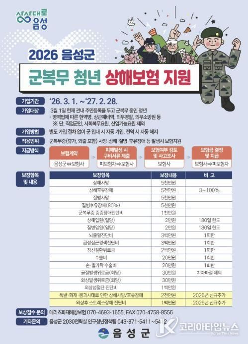 코리아타임뉴스 충북취재본부 | 음성군은 군복무 중인 지역 청년들이 예기치 못한 사고로부터 충분한 보장을 받을 수 있도록 ‘2026년 군복무 청년 상해보험 지원사업’을 추진한다고 밝혔다.
