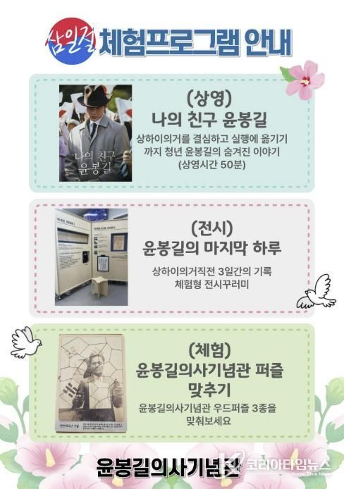 기념관 관계자는 “삼일절은 우리 민족의 독립 의지와 자유의 가치를 되새기는 뜻깊은 날로 관람객들이 체험을 통해 윤봉길 의사의 숭고한 정신을 자연스럽게 느끼는 시간이 되길 바란다”고 말했다.