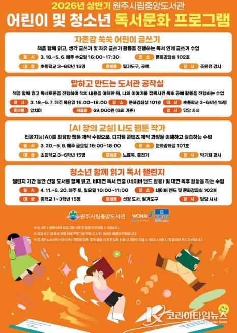 코리아타임뉴스 이아름 기자 | 원주시립중앙도서관은 오는 3월부터 6월까지 ‘2026년 상반기 어린이 및 청소년 독서문화 프로그램’을 운영한다.