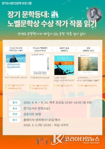코리아타임뉴스 문화팀 | 김포시 장기도서관은 인문학 프로그램 ‘장기 문학등대: 노벨문학상 수상 작가 작품 읽기’를 오는 4월 4일부터 4월 25일까지 매주 토요일 오후 2시에 장기도서관 문화교실2에서 운영한다고 밝혔다.