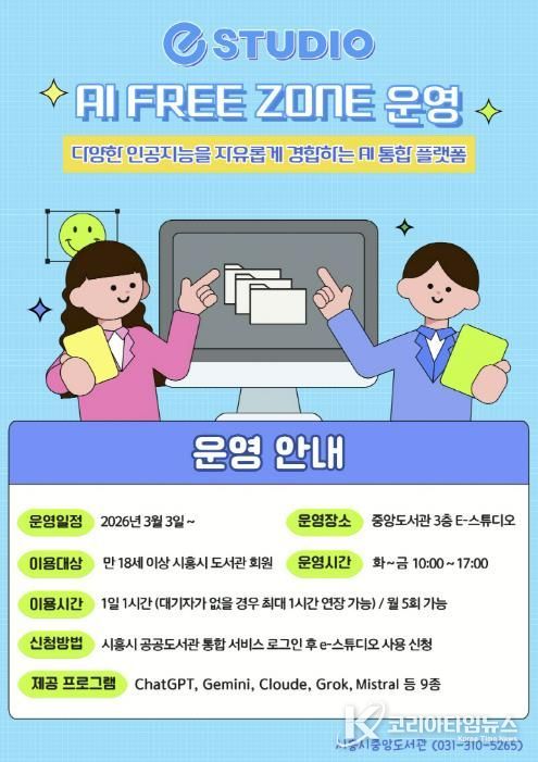 코리아타임뉴스 경기취재본부 | 시흥시중앙도서관은 시민들의 인공지능(AI) 활용 역량 강화를 위해 시 정보통신과와 협업해 도서관 3층 e-스튜디오에 ‘인공지능(AI) 프리 존(Free Zone)’을 구축하고, 오는 3월 3일부터 본격 운영에 들어간다.