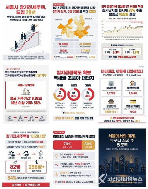 ‘장기전세주택’은 무주택 시민에게 장기간 안정적인 거주 환경을 제공하며 2007년부터 현재까지 241개 단지, 총 37,463호를 공급해 왔다. 지난 2024년에는 신혼부부에 특화된 ‘미리내집(장기전세주택Ⅱ)’을 새롭게 도입해 저출생 대응 주거정책으로 기능을 확대하고 있다. 현재 거주 중인 세대를 포함해 지금까지 총 43,907가구에 안정적인 주거를 제공했다.