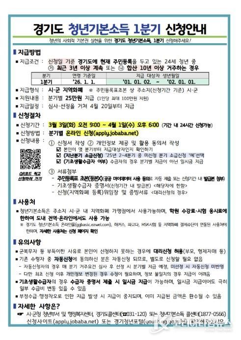 코리아타임뉴스 경기취재본부 | 동두천시는 2026년 1분기 청년기본소득 신청․접수를 3월 3일부터 4월 1일까지 한 달 간 접수한다고 밝혔다.