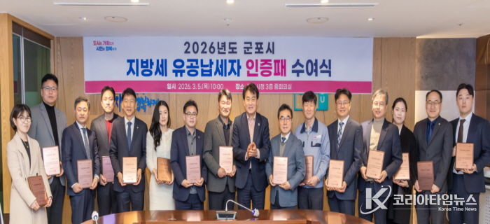 코리아타임뉴스 사회팀 | 군포시 하은호 시장은 3월 5일 지방세를 성실하게 납부하여 지방재정 확충에 기여한 유공납세자 15개 법인에게 ‘유공납세자 인증패’를 수여하고 감사의 마음을 전했다.