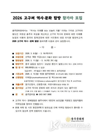 코리아타임뉴스 박찬식 기자 | 충주문화원(원장 유진태)이 중국 길림성 집안시와 요녕성 환인시에 위치한 고구려 역사·문화 유적을 탐방할 답사자 18명을 선착순 모집한다.