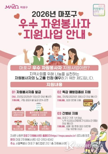 코리아타임뉴스 노승선 기자 | 마포구가 자원봉사자의 노고와 헌신에 보답하고 자원봉사 참여 문화를 확산하기 위해 올해부터 우수 자원봉사자를 대상으로 ‘인플루엔자 예방접종비’와 ‘간병비’를 새롭게 지원한다.