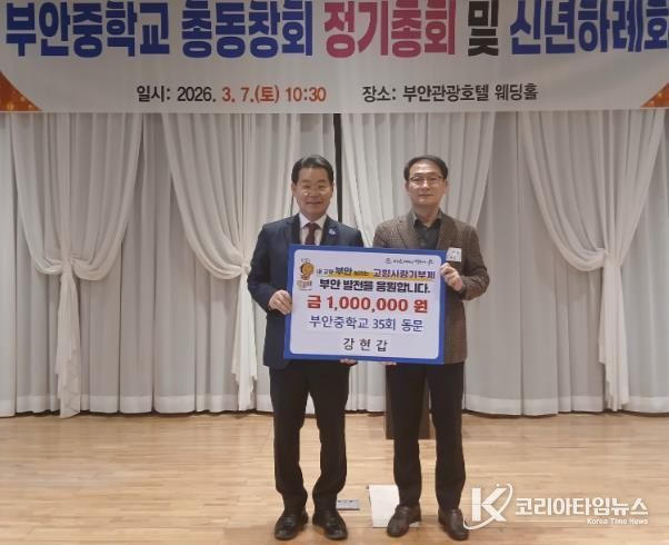 코리아타임뉴스 전북취재본부 | 부안군은 지난 7일 부안관광호텔에서 열린 부안중학교 총동창회 정기총회에서 35회 강현갑 동문이 고향사랑기부금 100만원을 기탁했다고 밝혔다.