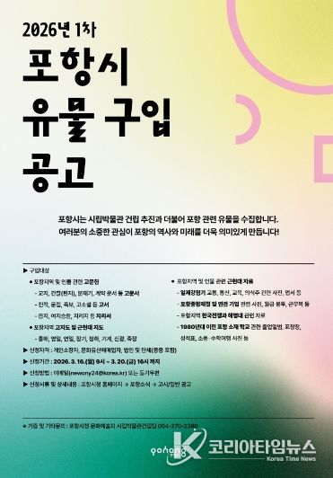 코리아타임뉴스 경북취재본부 | 포항시는 시립박물관 건립을 위한 전시 자원 확보를 위해 오는 16일부터 20일까지 ‘2026년 1차 포항시 유물 구입’을 진행한다고 밝혔다.