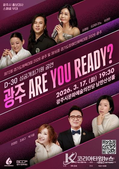 코리아타임뉴스 이아름 기자 | 광주시문화재단은 오는 3월 17일 오후 7시 30분, 광주시문화예술의전당 남한산성홀에서 ‘제72회 경기도체육대회 2026 광주 및 제16회 경기도장애인체육대회 2026 광주 D-30 성공기원 공연’ '광주! ARE YOU READY?'’를 개최한다.