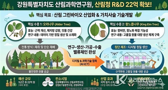 코리아타임뉴스 이아름 기자 | 강원특별자치도 산림과학연구원은 산림청이 주관하는 ‘산림분야 그린바이오 미래형 가치사슬 기술개발’ 공모사업에 최종 선정돼 5년간 총 22억 원의 국비를 확보했다고 밝혔다.