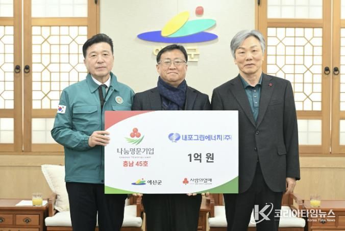 코리아타임뉴스 김택호 기자 | 예산군 삽교읍 소재 내포그린에너지㈜가 사회복지공동모금회 ‘나눔명문기업’(충남 45호)에 가입하며 지역사회 나눔문화 확산과 사회적 가치 실현에 동참했다.