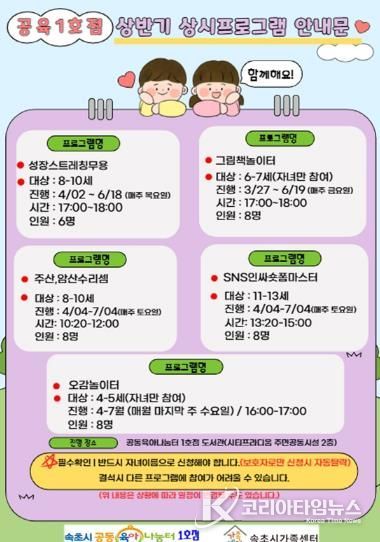 초등 프로그램은 △주산 암산 수리 셈 △성장 스트레칭 무용 △SNS 인싸 숏폼마스터로 운영되며, 유아 프로그램은 △그림책놀이 △사랑을 접다! 종이접기 △오감 놀이터로 진행된다.