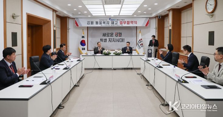 코리아타임뉴스 이아름 기자 | 강원특별자치도는 3월 10일 오전 10시, 도청 본관 2층 소회의실에서 (재)소노수의재단과 '강원 동물복지 제고'를 위한 업무협약을 체결했다.