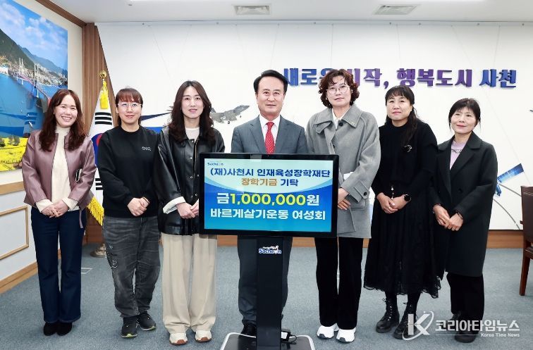 코리아타임뉴스 경남취재본부 | 바르게살기운동 사천시협의회 여성회(회장 이옥진)는 10일 사천시청 시장실을 방문하여 지역 사회의 미래를 이끌어갈 인재 양성을 위해 사용해 달라며 사천시 인재육성장학재단(이사장 박동식)에 장학금 100만 원을 기탁했다.