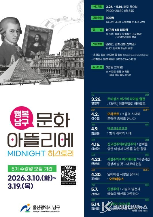 이번 5기 과정은 ‘MIDNIGHT 히스토리’라는 주제로 퇴근 후 저녁 시간을 활용해서 예술적 감성을 충전하고 싶은 남구민을 위해 마련됐고 강연은 3월 26일부터 5월 14일까지 매주 목요일 저녁 7시에 진행된다.