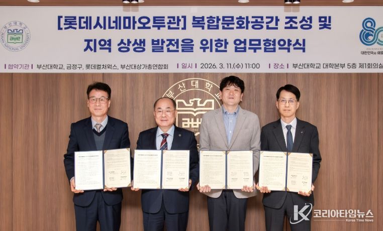 코리아타임뉴스 부산취재본부 | 부산 금정구는 지난 11일 부산대학교 본관 5층 제1회의실에서 부산대학교, 롯데컬처웍스, 부산대상가총연합회와 ‘오투관’ 복합문화공간 조성 및 지역 상생 발전을 위한 업무협약을 체결했다.