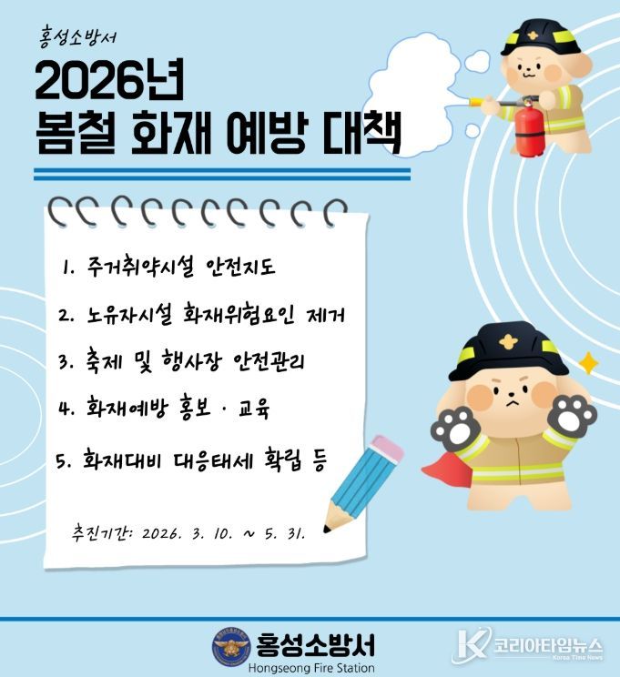 코리아타임뉴스 김태훈 기자 | 홍성소방서는 봄철 건조한 날씨와 강풍, 야외활동 증가 등으로 화재 발생 위험이 높아짐에 따라 오는 5월 31일까지 3개월간 봄철 화재예방대책을 본격 추진한다고 밝혔다.
