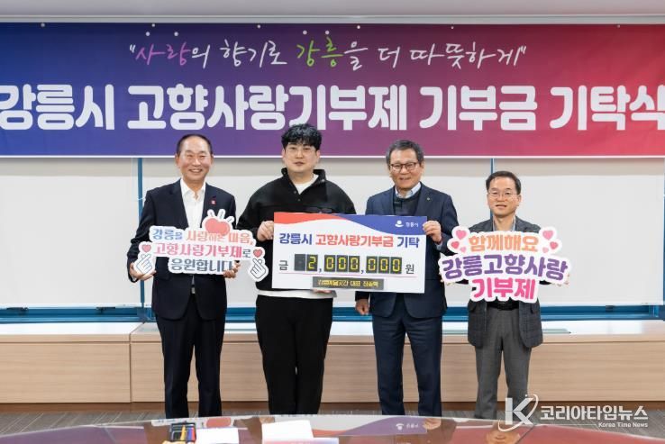 이날 강릉예닮곳간은 고향사랑기부금 200만 원을 기탁했으며, 장종혁 대표와 부친인 장성철 엘림생명샘교회 목사가 참석해 지역사회 발전과 나눔 문화 확산을 위한 뜻을 전했다.