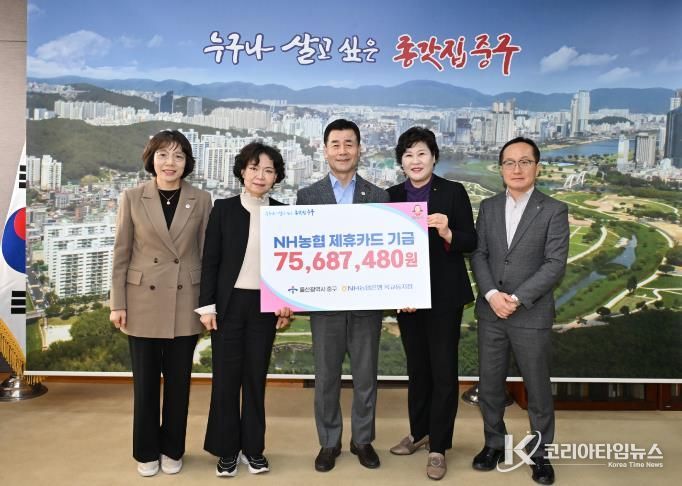코리아타임뉴스 울산취재본부 | NH농협은행 옥교동지점이 3월 12일 오전 10시 30분 중구청 구청장실을 방문해 제휴카드 발전 기금 7,568만 원을 전달했다.