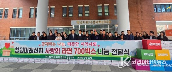 코리아타임뉴스 오영주 기자 | 창원시특례시는 12일 경남사회적경제혁신타운 중앙광장에서 창원미래신협이 (사)경남사회적기업협의회 창원지부에 관내 취약계층을 위한 라면 700박스 기탁 행사를 진행했다고 밝혔다.