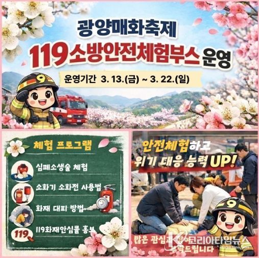 코리아타임뉴스 김태훈 기자 | 전남소방본부가 오는 13일부터 22일까지 10일간 열리는 ‘제25회 광양매화축제’ 현장에서 산하 광양소방서를 주축으로 ‘119소방안전체험부스’를 운영한다고 밝혔다.