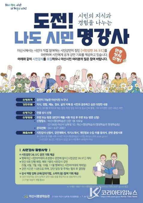 코리아타임뉴스 김택호 기자 | 아산시는 시민 각자의 지식과 삶의 이야기를 공유하는 참여형 프로그램 '시민강연 36.5℃'에 함께할 시민강사를 모집한다.