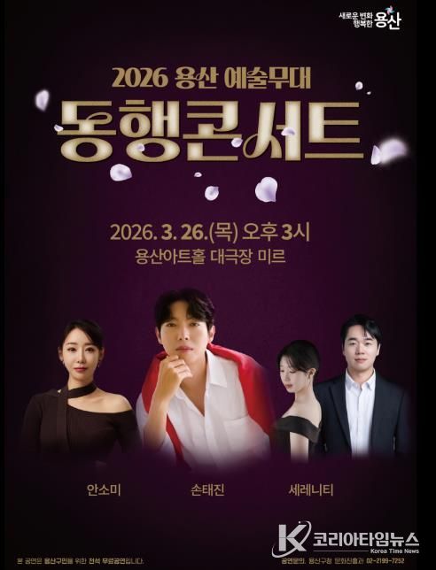 코리아타임뉴스 윤광희 기자 | 서울 용산구가 오는 26일 오후 3시, 용산아트홀 대극장 미르(녹사평대로 150, 지하 2층)에서 ‘2026 용산 예술무대 동행콘서트’를 개최한다. 바쁜 일상에 지친 구민들에게 따뜻한 위로를 전하기 위한 자리다.