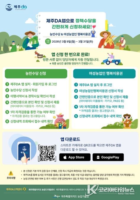 농민수당 및 여성농업인 행복이용권 지원사업 신청기간은 3월 31일까지이며, 제주DA 앱을 통한 비대면 신청 서비스는 3월 9일 시범 운영을 시작해 공공 마이데이터 서비스 승인 절차를 거쳐 3월 16일부터 정식 운영할 예정이다.