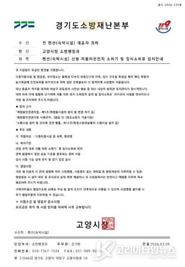 시는 최근 '소방시설 설치 및 관리에 관한 법률'등을 근거로 리튬이온 전지 소화장치 설치 및 질식소화포 유지관리 의무가 있다며, 고양시를 사칭한 공문서를 제시하고 일산서구 소재 숙박업소에 접근했다는 제보를 받았다.