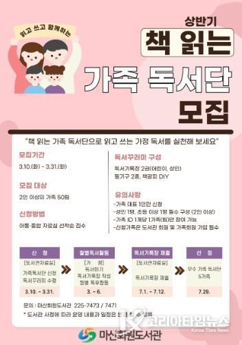 코리아타임뉴스 오영주 기자 | 창원시 마산회원도서관은 가족 독서문화 확산을 위해 ‘책 읽는 가족 독서단’을 운영하고 3월 10일 부터 3월 31일까지 상반기 참여 가족을 모집한다.